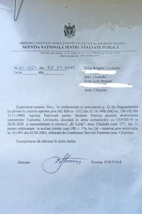 Ecaterina Litvinschi, prima doctoră decedată de COVID-19 și a fost înmormântată într-un sector separat, unde autoritățile pregătiseră 1 000 de gropi pentru viitorii decedați de coronavirus, chiar dacă persoana avea loc rezervat lângă soțul ei decedat în 1996, va fi reînhumată. Ion Botnari, nepotul doctoriței, a anunțat că a obținut de la autorități permisiunea de a o deshuma pentru a transfera corpul neînsuflețit într-un alt loc.
