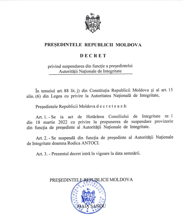 DOC Este oficial. Președinta Sandu a semnat decretul privind suspendarea Rodicăi Antoci din funcția de președintă a Autorității Naționale de Integritate