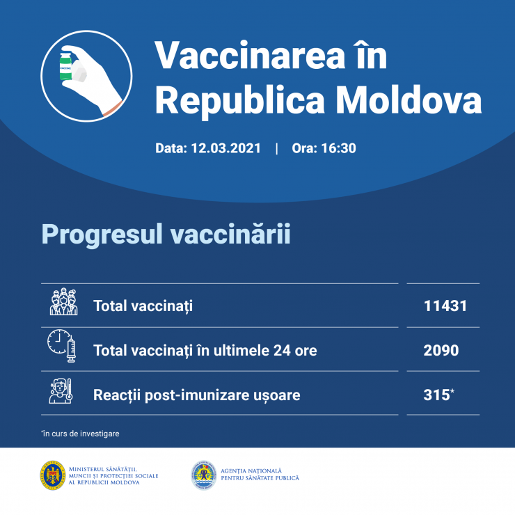 Conform reprezentanților MSMPS, în ultimele 24 de ore au fost vaccinate 2090 de persoane și au fost înregistrate 315 reacții post-imunizare ușoare, care sunt în curs de investigare.