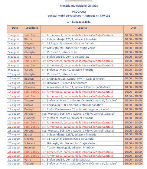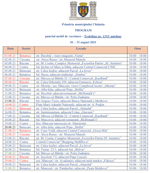 Potrivit autorităților municipale, luni, 2 august, în intervalul orelor 10:00-18:00, cele 2 puncte de vaccinare mobile: troleibuz și autobuz, se vor afla în următoarele locații: troleibuzul va fi în sectorul Ciocana, strada Alecu Ruuso colţ cu strada Meşterul Manole, iar autobuzul se va deplasa în comuna Băcioi, strada Independenţei, 125/1, în preajma sediului Primăriei.