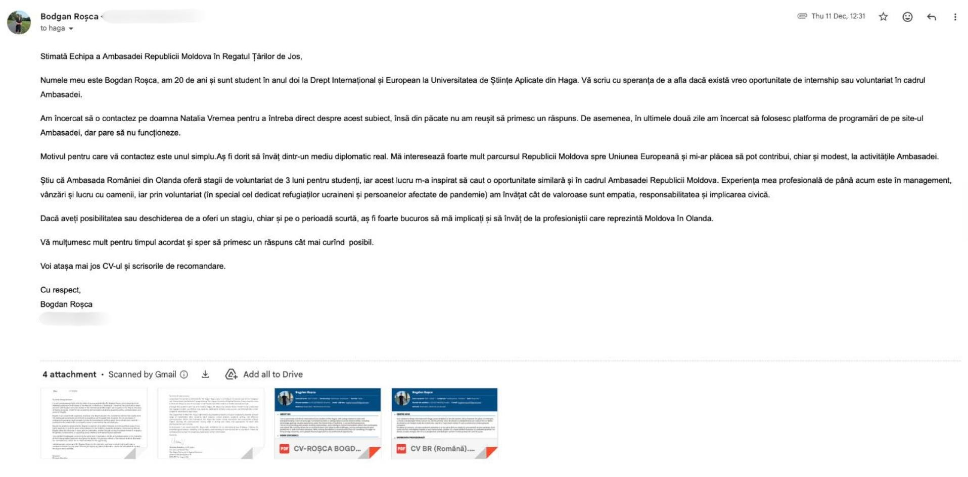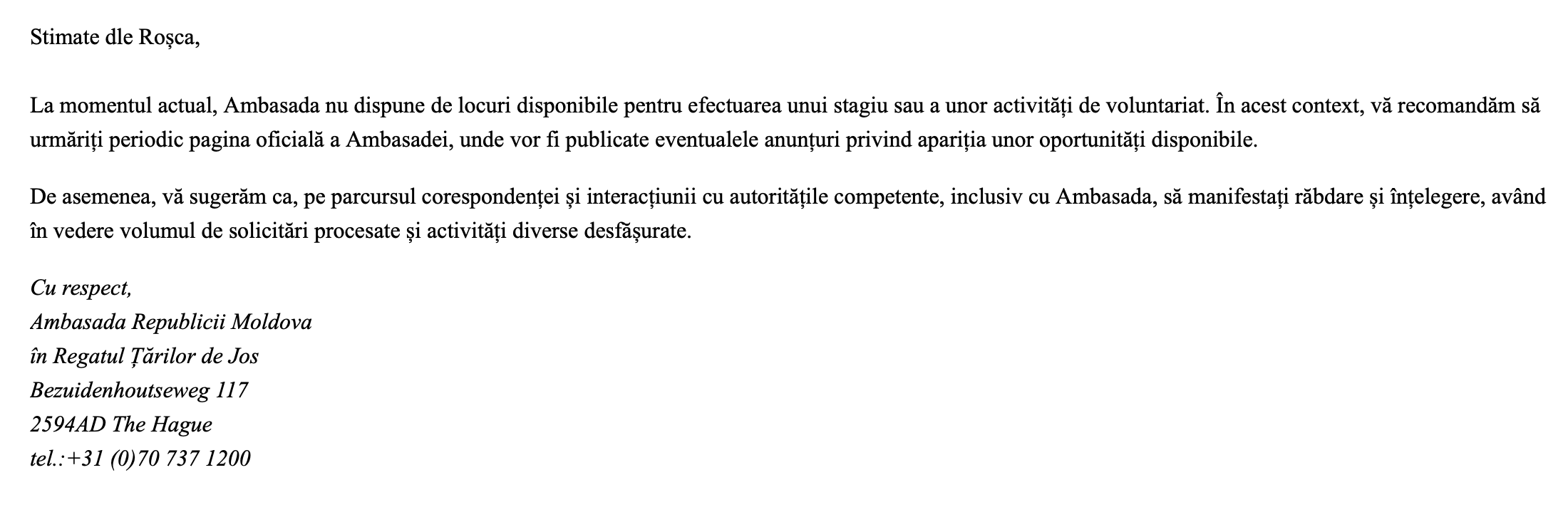 După câteva zile, răspunsul a venit, însă nu era cel așteptat. În câteva cuvinte, ambasada l-a informat că nu există locuri disponibile pentru „efectuarea unui stagiu sau a unor activități de voluntariat”. I s-a mai relatat că instituția este foarte ocupată și că ar trebui să urmărească pagina oficială pentru eventuale oportunități.