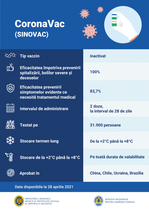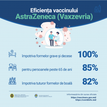 — Toate vaccinurile împotriva COVID-19 care au fost aprobate spre utilizare în Moldova sunt sigure și eficiente pentru a preveni îmbolnăvirea cu noul virus, prevenind formele grave de COVID-19, spitalizarea și decesul cauzat de noul virus. Totodată, vaccinurile oferă protecție și împotriva noilor tulpini de COVID-19, precum cea britanică sau braziliană. Asta pentru că aceste vaccinuri creează un răspuns imun larg.