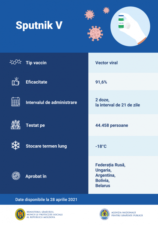 Sputnik-V e un vaccin produs la Moscova și se administrează în două doze, la un interval de 28 de zile, persoanelor cu o vârstă de peste 18 ani. Vaccinul e sigur și eficient, aprobat în 62 de țări, inclusiv în R. Moldova. S-a demonstrat o eficiență de 91,6% împotriva COVID-19 și o eficiență de 100% împotriva formelor severe de COVID-19.