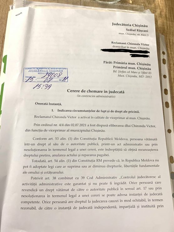 Fostul viceprimar al capitalei Victor Chironda anunță că a depus cerere de chemare în judecată. Chironda susține că a contestat argumentarea deciziei de demitere a lui – „precum că eu aș fi lipsit nemotivat de la serviciu și că nu mi-aș fi îndeplinit atribuțiile de serviciu”.
