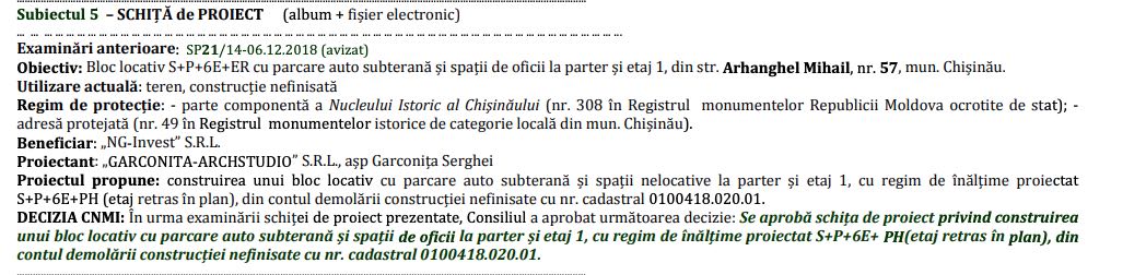 Un bloc locativ este ridicat pe strada Arhanghel Mihail din Chișinău, în centrul istoric al orașului, pe un teren care aparține Primăriei, fără ca autoritățile să fi emis acte permisive. Panoul informativ de șantier, care ar trebui să indice cine construiește și ce anume se edifică, a fost instalat abia în timpul celei de-a doua vizite a echipei Ziarul de Gardă la fața locului, la peste o lună de la începerea lucrărilor. Compania care a inițiat construcția, „NG-INVEST” SRL, a fost implicată și anterior în scandaluri imobiliare. Ministerul Culturii a acuzat Primăria Chișinău că ar favoriza firma și că ar „simula procesele de judecată” în litigiile cu aceasta.