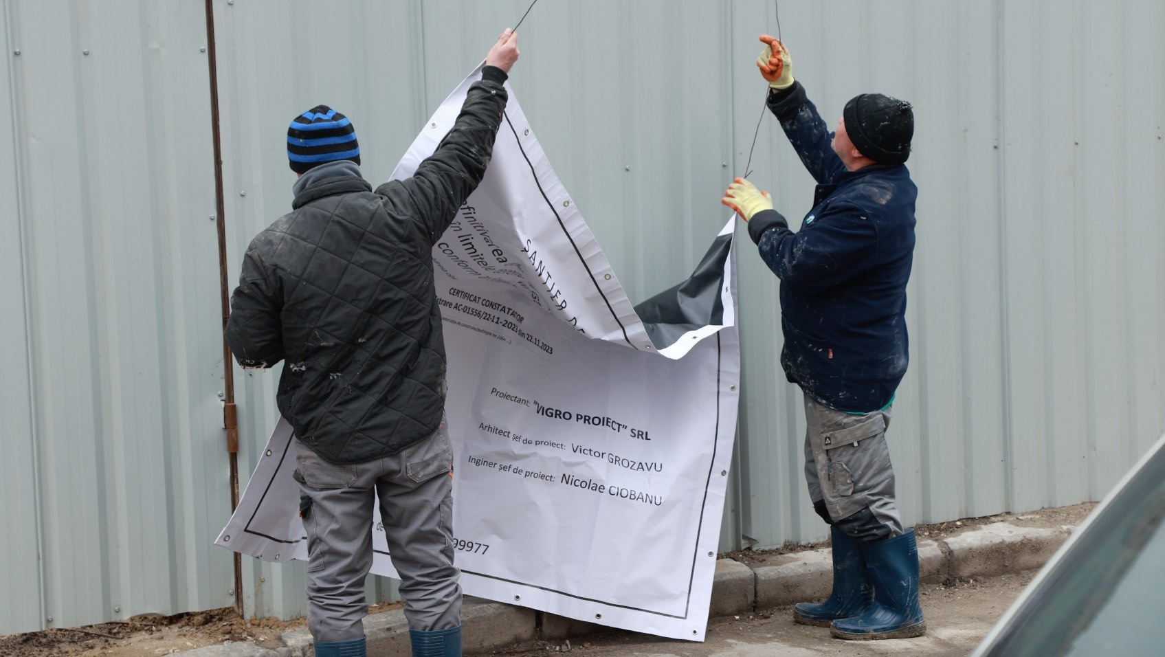 Poarta șantierului este încuiată, însă muncitori pot fi observați atât în interior, cât și în exterior.