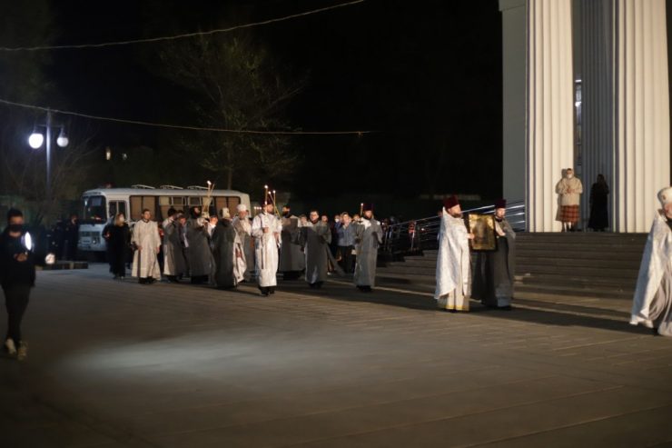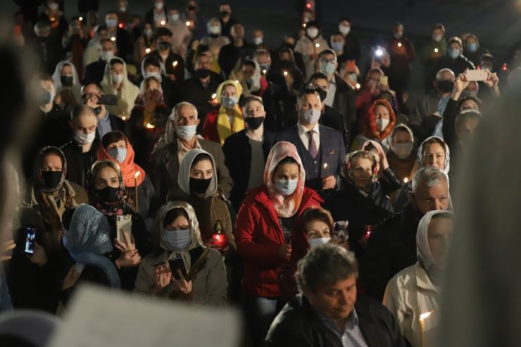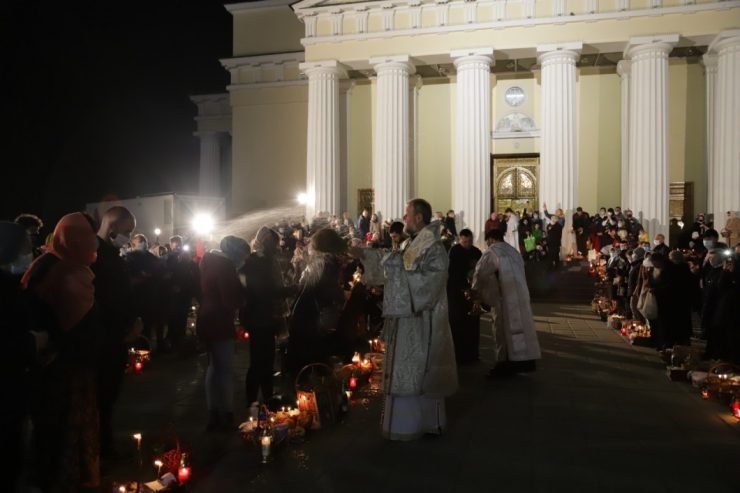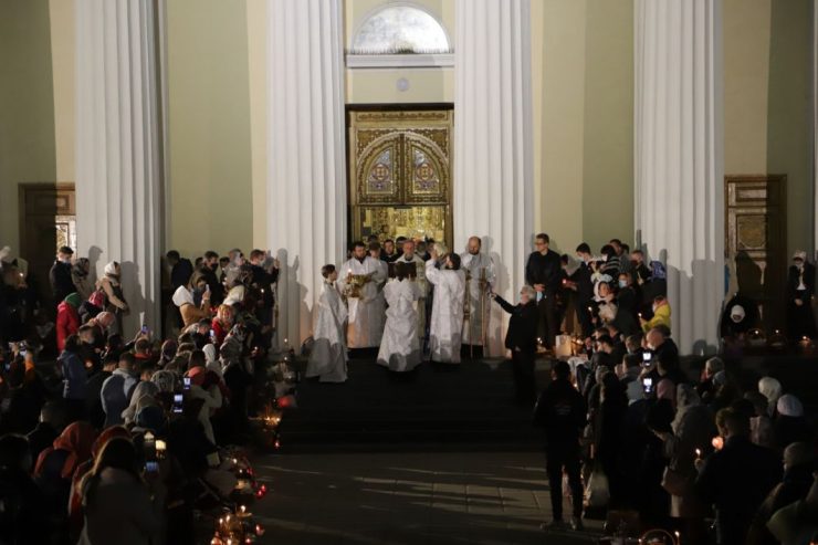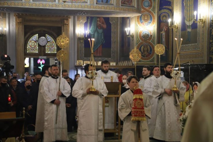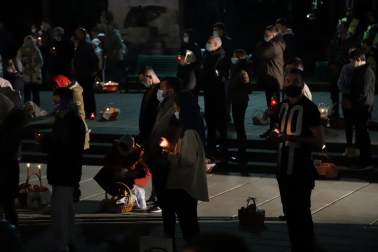 La slujba de Înviere de la Catedrala Mitropolitană „Nașterea Domnului” au asistat azi-noapte zeci de credincioși. Cu distanțare fizică și măști, oamenii au asistat la slujbă și și-au sfințit bucatele pentru masa de sărbătoare.