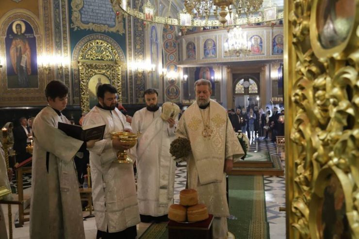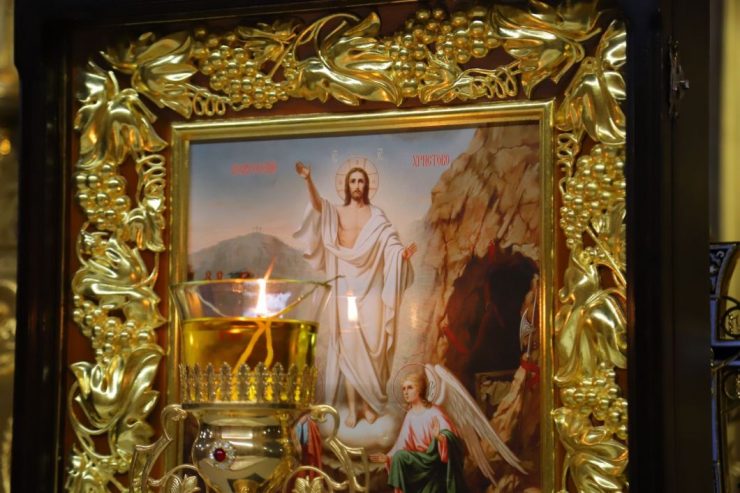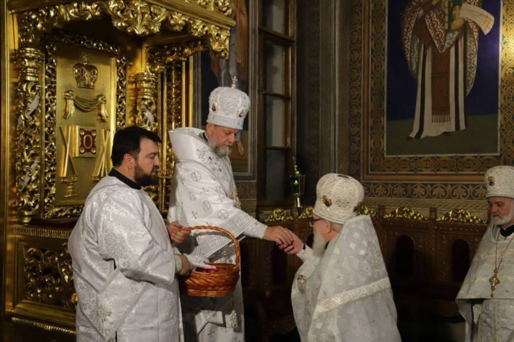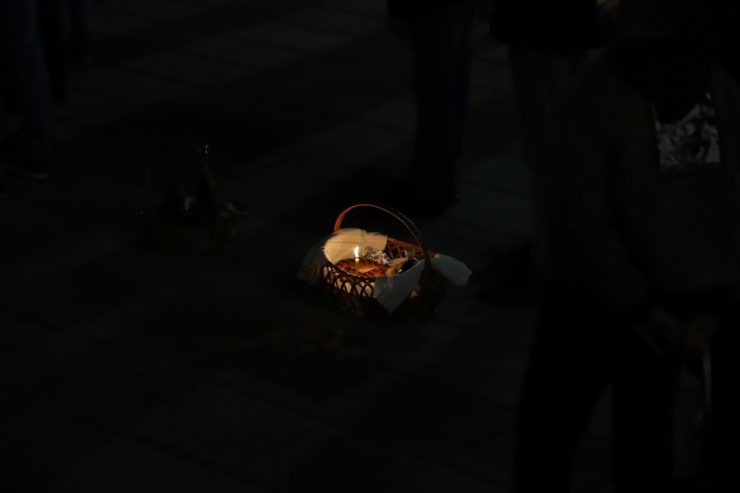 Aproape de zorii zilei, după slujbă, Întâistătătorul, salutând credincioșii cu tradiționalul salut pascal, a sfințit prinoasele acestora.