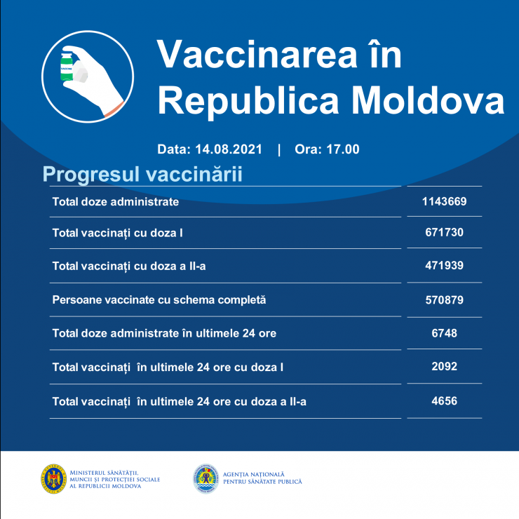 De la începutul campaniei de vaccinare, potrivit datelor prezentate sâmbătă, 14 august, de către MSMPS, în R. Moldova au fost administrate 1 143 669 de doze de vaccin împotriva noului coronavirus.