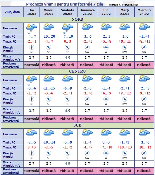 Pe timp de noapte, vremea se va răci accentuat în toată țara, astfel ca temperaturile maxime vor fi cuprinse între -1 și -6 grade, iar cele minime între -11 și -20 de grade Celsius. Cerul va fi variabil în regiunile nord-vestice, dar va avea înnorări temporare în restul teritoriului.