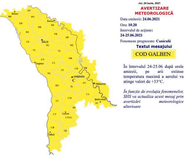 Serviciul Hidrometeorologi de Stat (SHS) a emis joi, 24 iunie, cod galben de caniculă. Avertizarea meteorologică este valabilă pentru perioada 24 – 25 iunie.