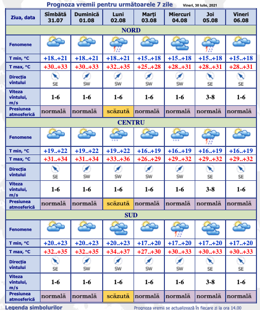 Potrivit SHS, în următoarele zile, pe timp de zi se prevede cer senin, iar maximele vor indica până la 35 de grade Celsius. Noaptea temperatura maximă a aerului se va situa între +18ºC şi +23ºC.
