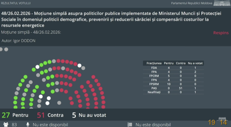 Parlamentul a respins moțiunea simplă asupra politicilor publice implementate de Ministerul Muncii și Protecției Sociale în domeniul politicii demografice, prevenirii și reducerii sărăciei și compensării costurilor la resursele energetice.
