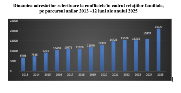 Potrivit poliției, în 2025 au fost înregistrate aproape 24 de mii de adresări privind conflictele familiale, cu 7 751 mai multe decât în anul precedent. În urma acestor cazuri, au fost identificate peste 1300 de persoane abuzate, dintre care 960 sunt femei și 127 copii. De asemenea, au fost emise 781 de ordonanțe de protecție pentru femei și 231 pentru femei și copii.