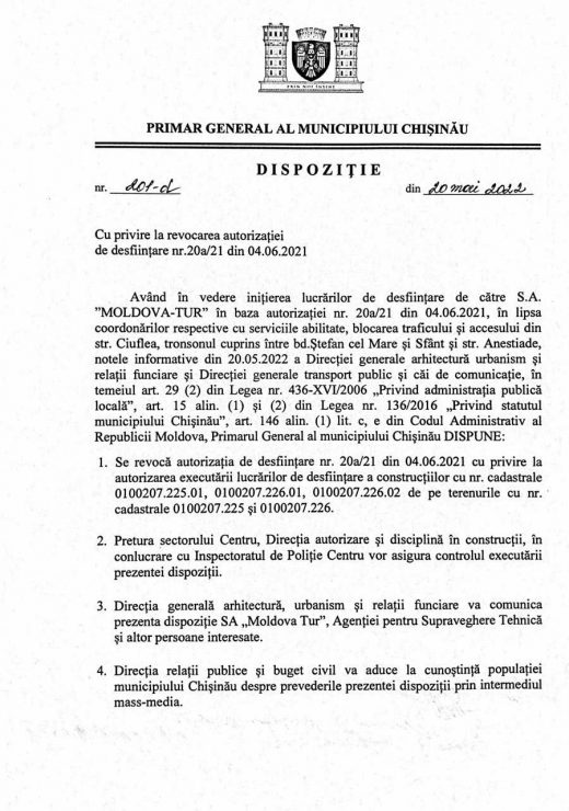 Primăria municipiului Chișinău a revocat autorizația de demolare a Hotelului Național. Potrivit responsabililor de la Primărie, o dispoziție în acest sens a fost emisă și semnată vineri, 20 mai, de către primarul Capitalei, Ion Ceban, „ca urmare a încălcărilor depistate la fața locului, inclusiv ce țin de amplasarea gardului pe drumul public și stoparea circulației rutiere, fără a avea vreun temei juridic”.
