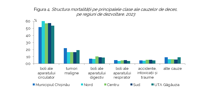 În clasa deceselor prin bolile aparatului respirator ponderile mai ridicate au fost înregistrate în municipiul Chișinău (5,3%) și în regiunea Sud (5,1%), iar în regiunile de Centru și Sud a fost înregistrat un nivel mai înalt al mortalității provocate de cauzele externe (accidente, intoxicații și traume) – 5,4%, comparativ cu alte regiuni de dezvoltare