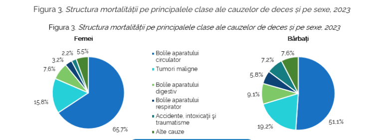 Potrivit datelor ANSP, incidența cauzelor de deces este diferită pentru bărbați și femei. Mortalitatea femeilor prin bolile aparatului circulator este cu 14,6 p.p. mai înaltă decât cea înregistrată pentru bărbați. Discrepanțe majore între sexe au fost observate și în cazul mortalității prin accidente, intoxicații și traume, tumori maligne și bolile aparatului respirator, în acest caz fiind observată o „supramortalitate masculină”. Numărul bărbaților decedați în urma accidentelor, intoxicațiilor și traumelor este de 3,8 ori mai mare comparativ cu numărul femeilor decedate din aceeași cauză, decesele datorate bolilor aparatului respirator de 2,1 ori, cele cauzate de tumorile maligne și bolile aparatului digestiv de 1,4 ori.