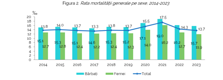 „Numărul de decese înregistrate, în anul 2023, a fost de 33,7 mii, conform datelor provizorii, în descreștere, cu 2,5 mii (sau cu 6,8%) față de anul 2022. În anul 2023, rata mortalității generale a constituit 13,7%, fiind în descreștere cu 0,6 decese la o mie de locuitori față de anul 2022. Analiza pe sexe a relevat un nivel al mortalității de 15,7% pentru bărbați și 11,9% pentru femei”.