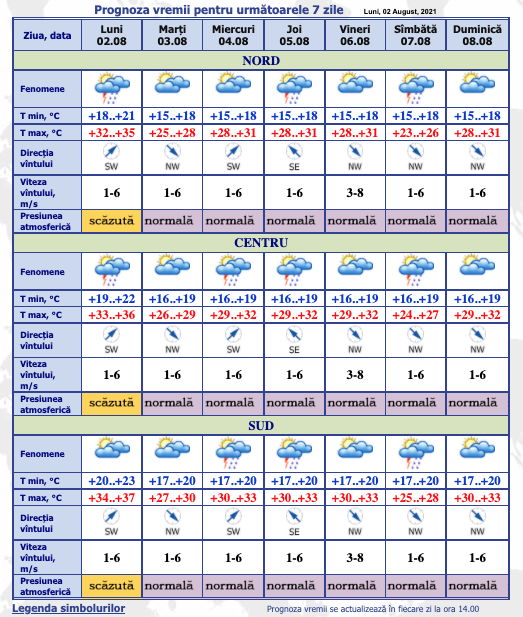 Meteorologii au actualizat luni, 2 august, prognoza specială, avertizând că în raioanele de nord și centru ale R. Moldova vor fi ploi cu descărcări electrice, însă vremea se va menţine caldă cu temperaturi maxime de 37 de grade Celsius.