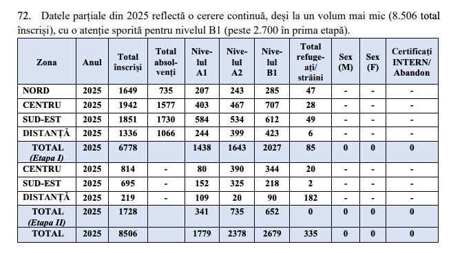 Femeile reprezintă majoritatea covârșitoare a cursanților în ambele perioade de cursuri organizate anterior, cu un procent care a crescut de la aproape 76% în 2023 la peste 81% în 2024. Deși numărul bărbaților înscriși la cursurile de limba română a crescut ușor (de la 2 467 la 2 759), numărul femeilor a crescut mult mai rapid, de la 7 725 la 11 979. În 2024, pentru fiecare bărbat înscris, au existat peste 4 femei înscrise, „consolidând programul ca fiind predominant feminin”, a observat MEC.