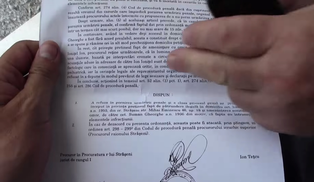 Ion Ionițel, locuitor al or.Strășeni, susține că, de mai bine de zece ani, a făcut mai multe demersuri adresate la Apă-Canal Stășeni pentru a-și conecta apartamentul la apă și canalizare. Aceștia însă au refuzat să-l conecteze, invocând că nu a achitat taxa de conectare și că nu are acordul vecinului său pentru aceste lucrări. Ionițel a încercat să-și convingă vecinul, dar nu a reușit. Între timp, relația cu acesta a devenit tensionată. Bărbatul a scris plânere la Procuratura din Strășeni pe faptul că vecinul ar fi pătruns ilegal în apartamentul său și l-ar fi amenințat cu moartea. La data de 16 mai 2016, procurorul Ion Teșcu a dispus neînceperea urmăririi penale din motiv că fapta nu ar întruni elementele infracțiunii.