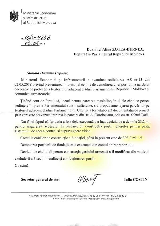 Parlamentul a cheltuit 393 de mii de lei pentru a construi fundamentul unui gard cu o înălțime de 2,5 metri care urmează să limiteze accesul la clădire din trei părți. În pofida investiției, recent, muncitorii au început să demoleze parțial fundamentul proaspăt ridicat. Motivul s-a dovedit a fi proiectarea defectuasă a spațiului de parcaree a automobilelor parlamentarilor. Respectiv, 25,2 metri de fundament a fost demontat pentru a asigura accesul în parcare, a instala poartă, gheretă pentru pază, sistem de acces-control și a camere de supraveghere video. Detaliile se găsesc într-un răspuns al Ministerului Economiei și Infrastructurii drept răspuns la o solicitare la subiect formulată de deputată liberală Alina Zotea. În total, din 2016 până în prezent, statul a plătit cu peste 133 de milioane de lei compania Glorinal Imobil SRL pentru finalizarea lucrărilor de amenajare interioară a nivelelor S,1-3 și amenajarea teritoriului adiacent Parlamentului.