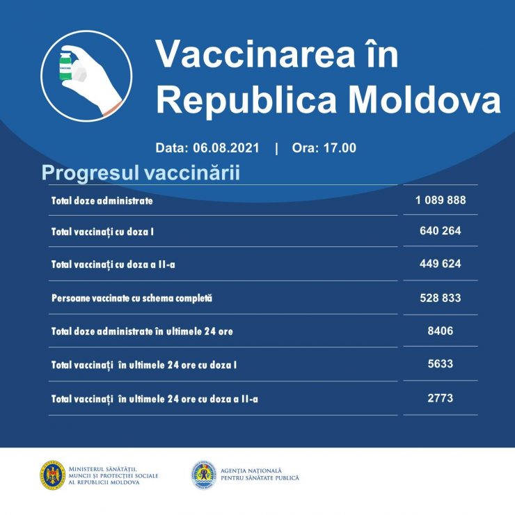 De la începutul campaniei de vaccinare, în R. Moldova au fost administrate 1 089 888 de doze de vaccin împotriva noului coronavirus: 640 264 de persoane vaccinate cu prima doză și 449 624 de persoane imunizate cu a doua doză.