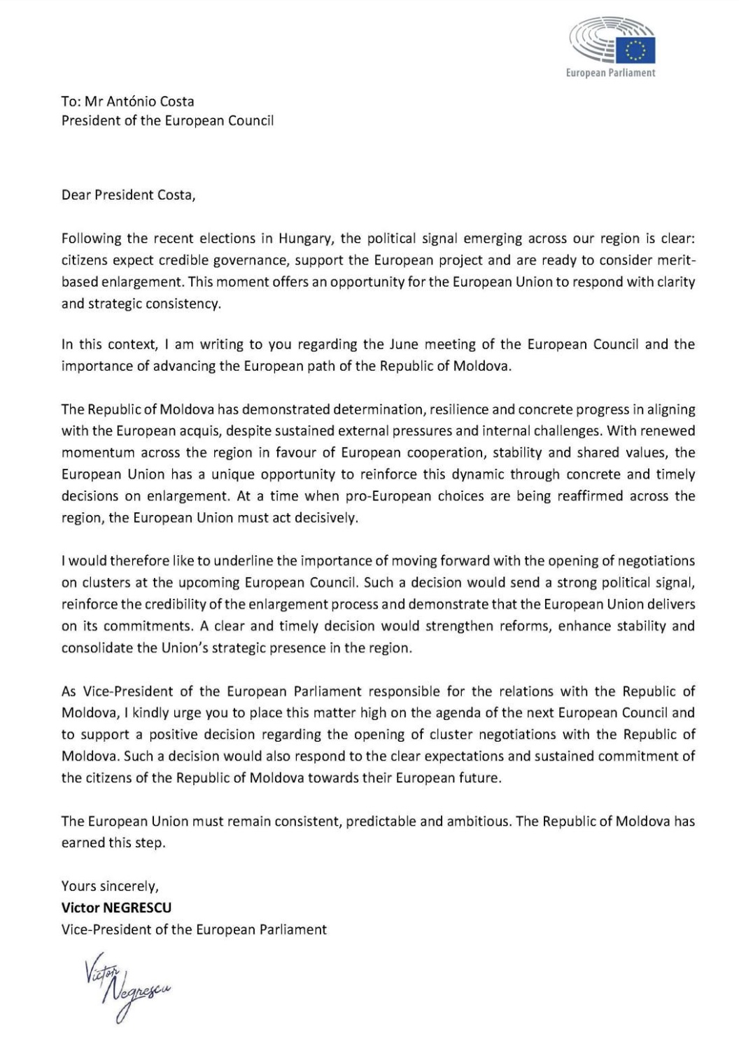 Scrisoarea adresată președintelui Consiliului European, António Costa a fost semnată de 55 de eurodeputați din 19 țări europene, la inițiativa vicepreședintelui Parlamentului European, Victor Negrescu, și reprezintă o solicitare de deschiderea imediată a negocierilor de aderare pe capitole cu R. Moldova.