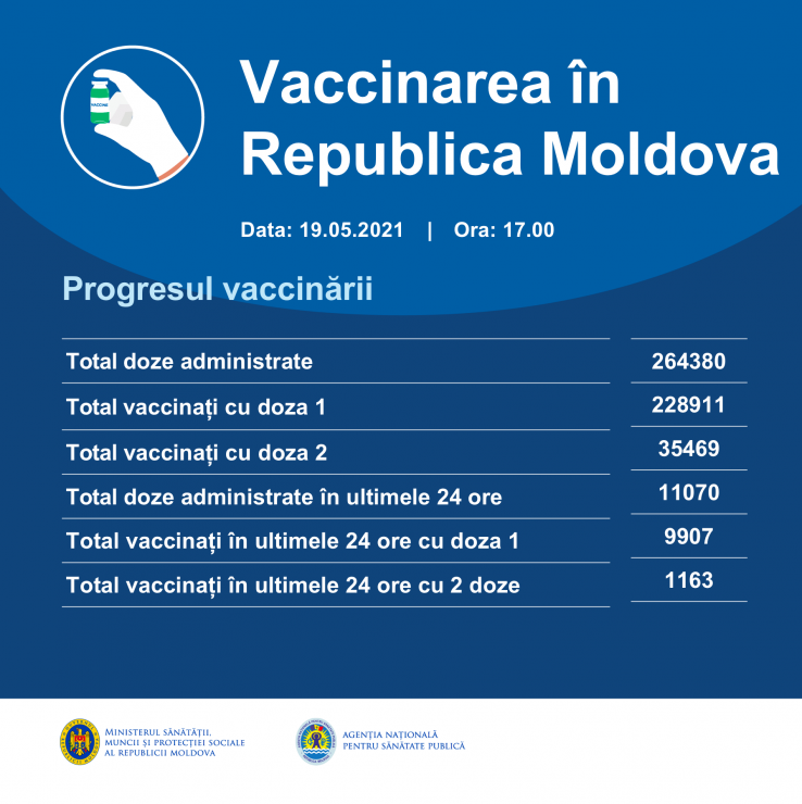 Până acum, în R. Moldova au fost administrate 264 280 de doze de vaccin. În ultimele 24 de ore, 9 907 de presoane au primit prima doză de vaccin anti-COVID, iar 1 163 – a doua doză.