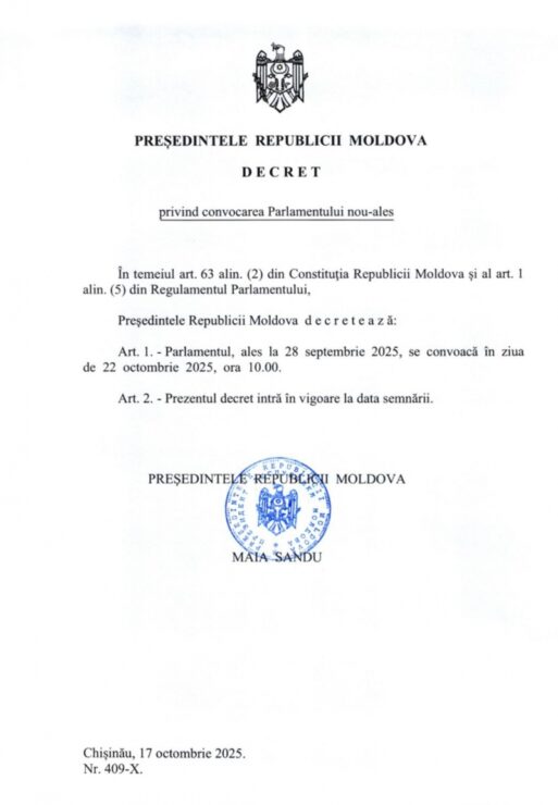 Președinta R. Moldova, Maia Sandu, a semnat vineri, 17 octombrie, Decretul privind convocarea Parlamentului R.Moldova de Legislatura a XII-a, anunță Președinția printr-un comunicat.