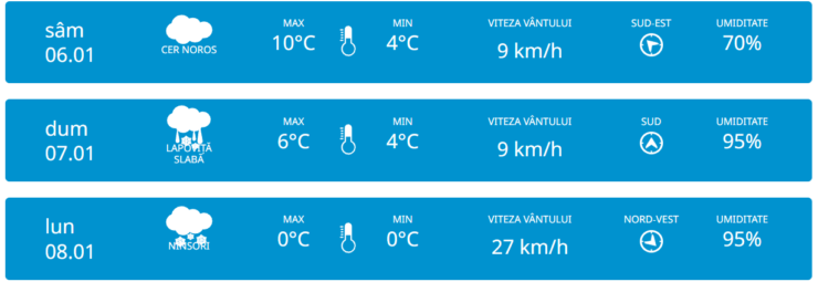 Mai exact, pe 7 ianuarie, duminică, se prognozează lapoviță slabă, temperatura maximă a aerului fiind de 6°C, iar cea minimă de 4°C. Precipitațiile vor continua și luni, 8 ianaurie, atunci însă acestea vor cădea sub formă de ninsoare. Termometrele vor arăta 0°, viteza vântului fiind de 27 km/h.