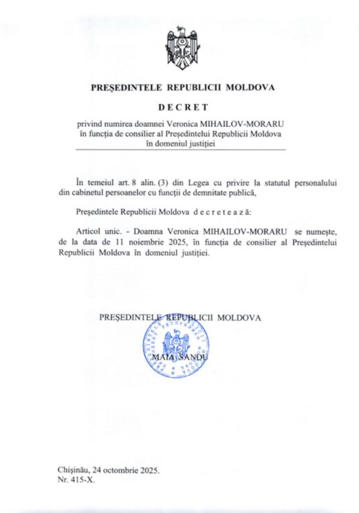 Veronica Mihailov-Moraru va ocupa funcția de consilieră prezidențială în domeniul justiției. Președinta Maia Sandu a semnat vineri, 24 octombrie, decretul. Astfel, Mihailov-Moraru își va începe activitatea în cadrul instituției prezidențiale la data de 11 noiembrie 2025, anunță Președinția. Aceasta nu se mai regăsi în funcția de ministră a justiției în noul Guvern.