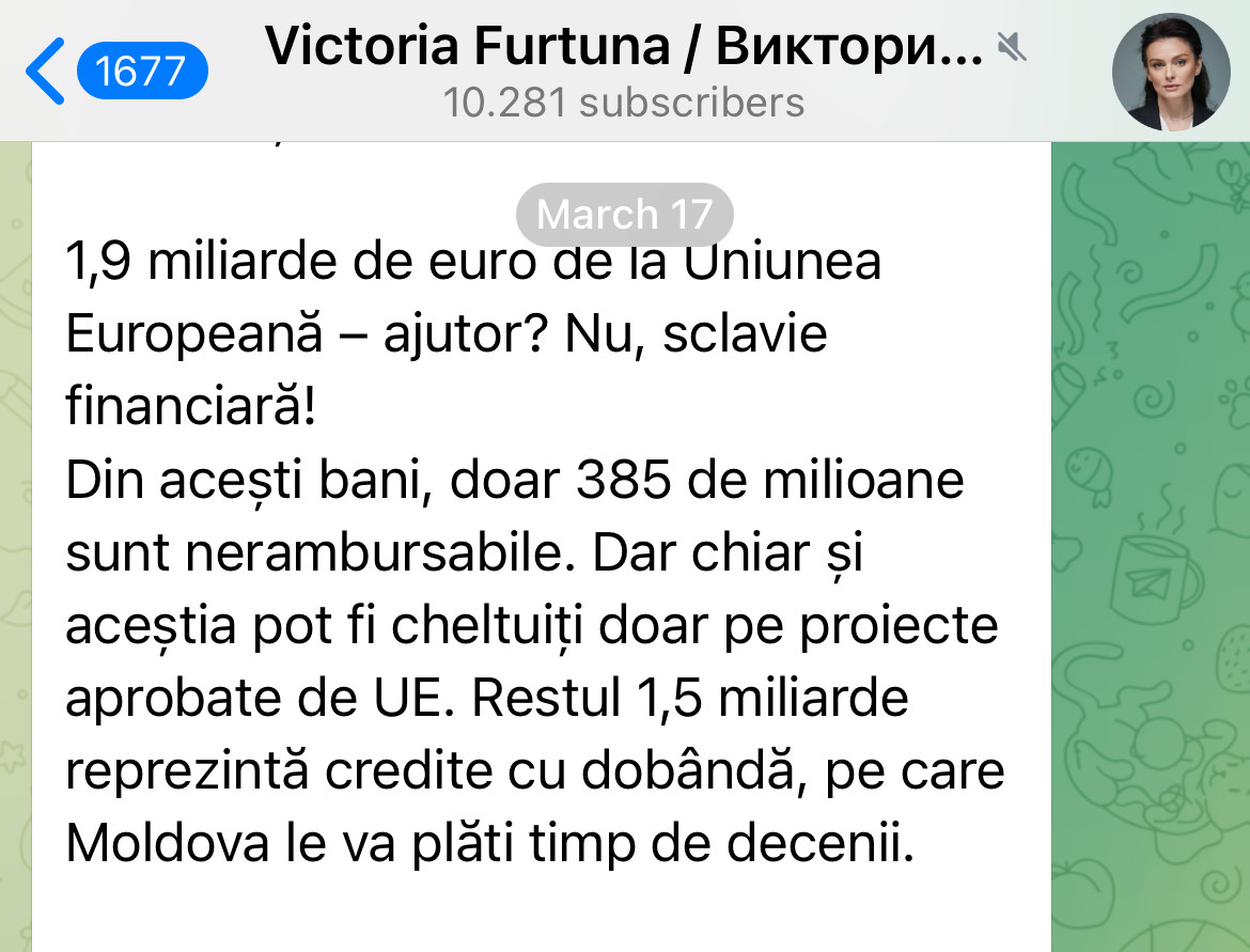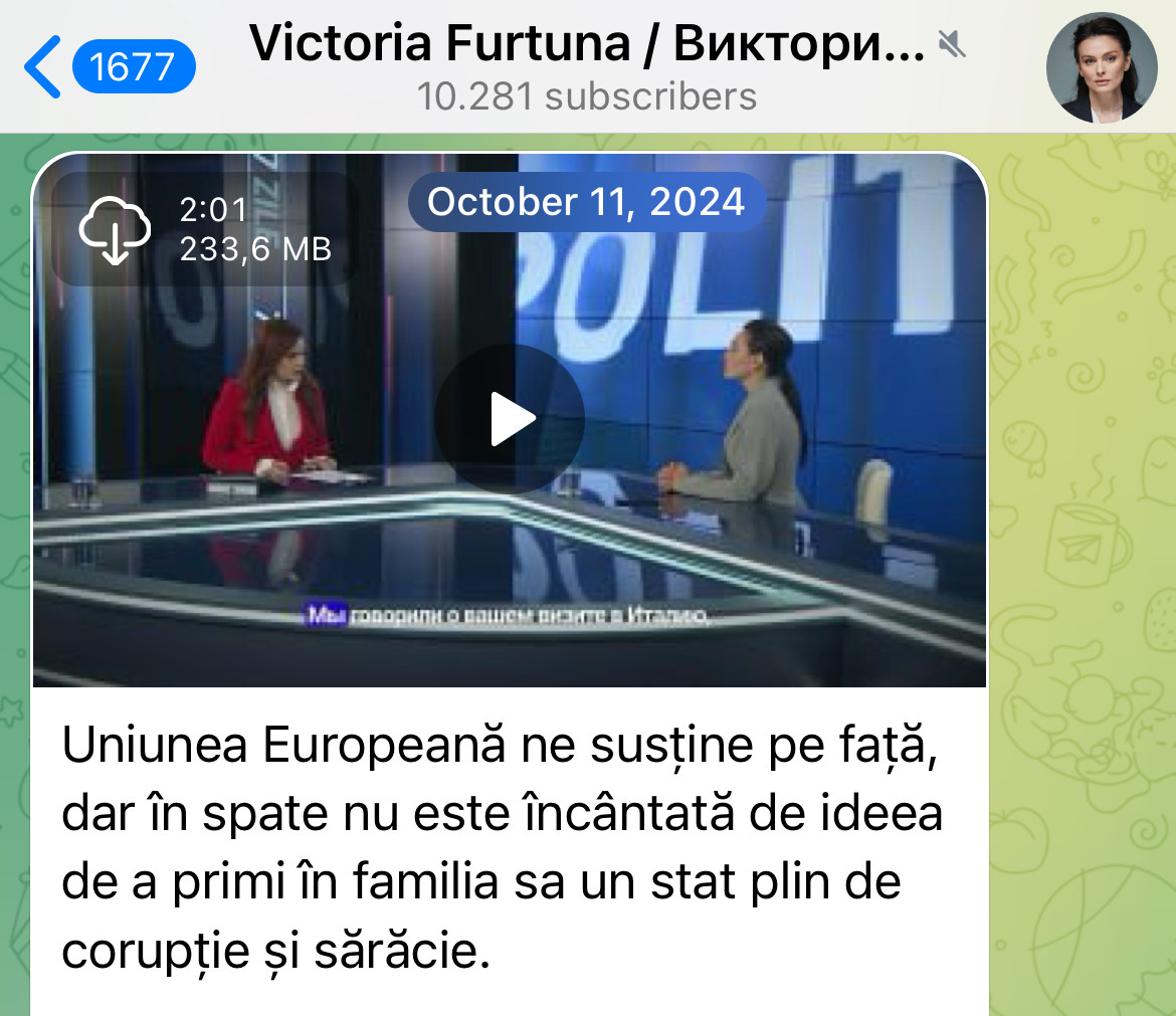 Cu doar câteva zile înainte să apară în spațiul public cu portretul lui Putin pe fundal, Victoria Furtună, candidata la alegerile prezidențiale din 2024 care, după cum a dezvăluit ZdG în investigația „În slujba Moscovei”, a fost susținută de Federația Rusă, prin intermediul rețelei controlate de Ilan Șor, a preluat conducerea partidului „Moldova Mare”, în statutul căruia este menționat că are „vocație europeană”.