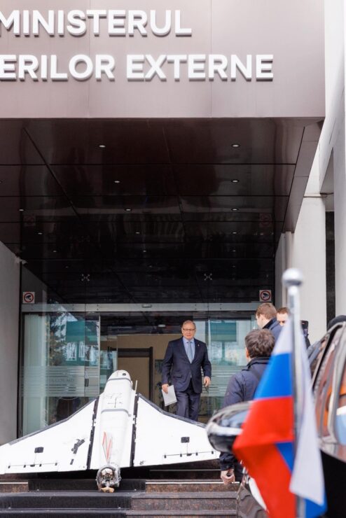La sediul MAE, diplomatului rus i-a fost prezentată drona de model Gerbera, găsită pe acoperișul unei case din Cuhureștii de Jos, raionul Florești. Aparatul de zbor a fost plasat chiar pe scările instituției.