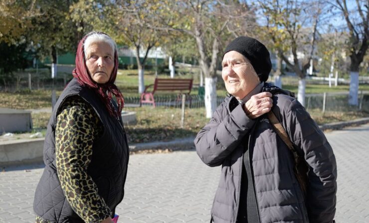 Două vârstnice se întorc de la marketul „Всегда низкие цены” (Întotdeauna prețuri mici, n.r.) de la intrarea din sat. Acestea spun că o urăsc pe Maia Sandu și că din cauza ei nici nu recunosc rezultatele alegerilor.