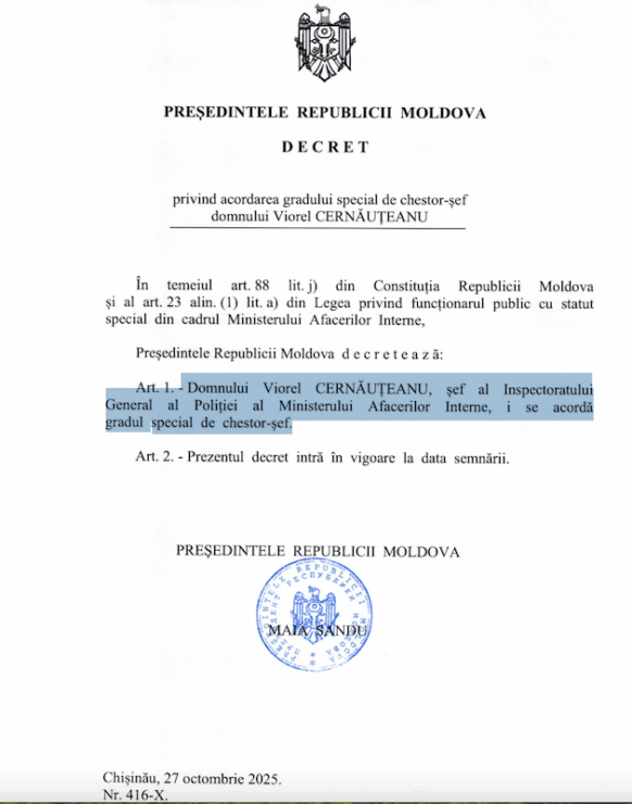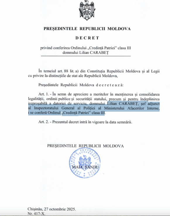 Viorel Cernăuțeanu, șef al Inspectoratului General al Poliției al Ministerului Afacerilor Interne, a obținut gradul special de chestor-șef, iar Lilian Carabeț, șef adjunct al Inspectoratului General al Poliției al Ministerului Afacerilor Interne, a fost decorat cu Ordinul „Credință Patriei” clasa III. Ambele decrete au fost semnate la 27 octombrie de către șefa statului Maia Sandu.