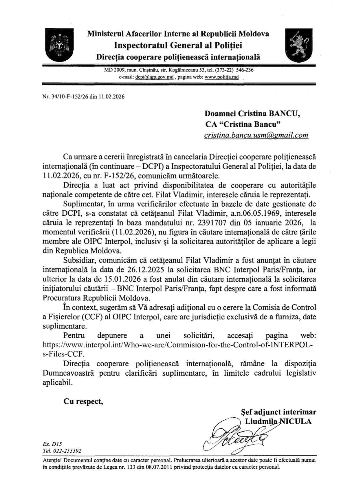 „În urma verificărilor efectuate în bazele de date gestionate de către DCPI, s-a constatat că cetățeanul Filat Vladimir, interesele căruia le reprezentați în baza mandatului, la momentul verificării (11.02.2026), nu figura în căutare internațională de către țările membre ale OIPC Interpol, inclusiv și la solicitarea autorităților de aplicare a legii din Republica Moldova.