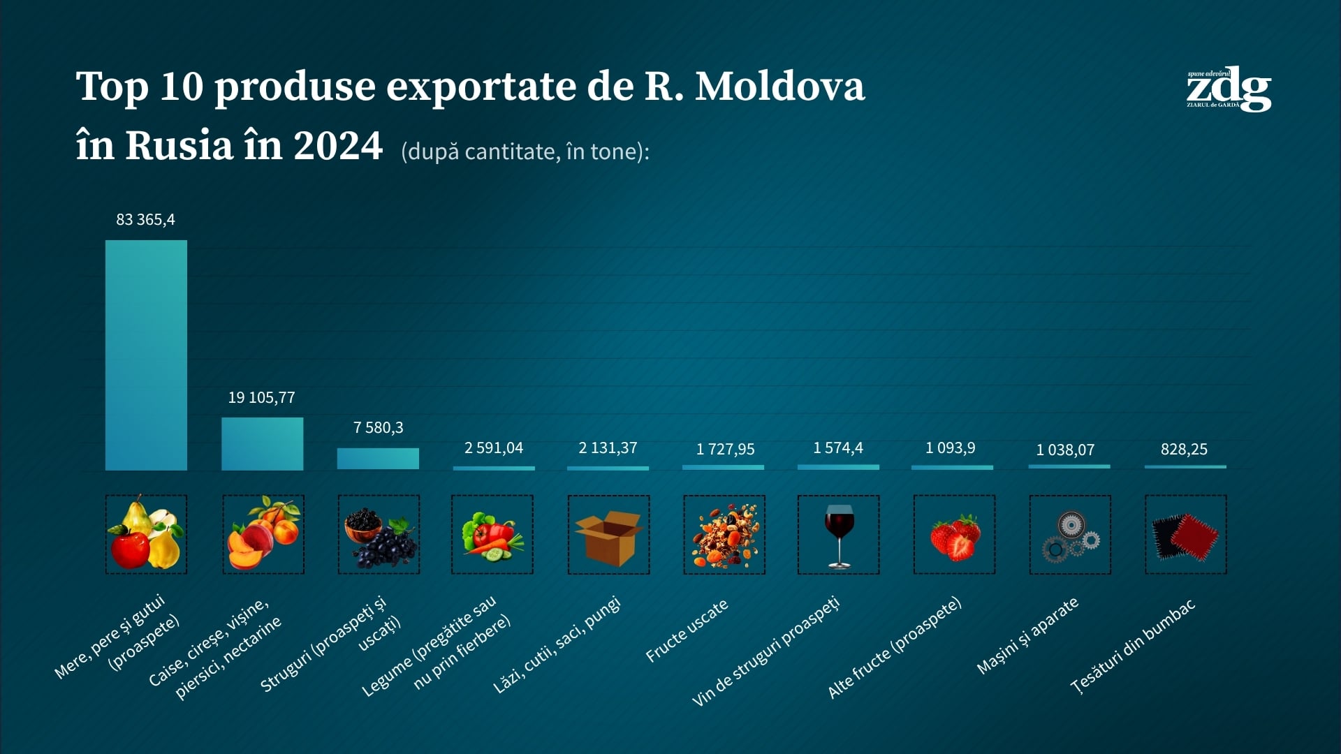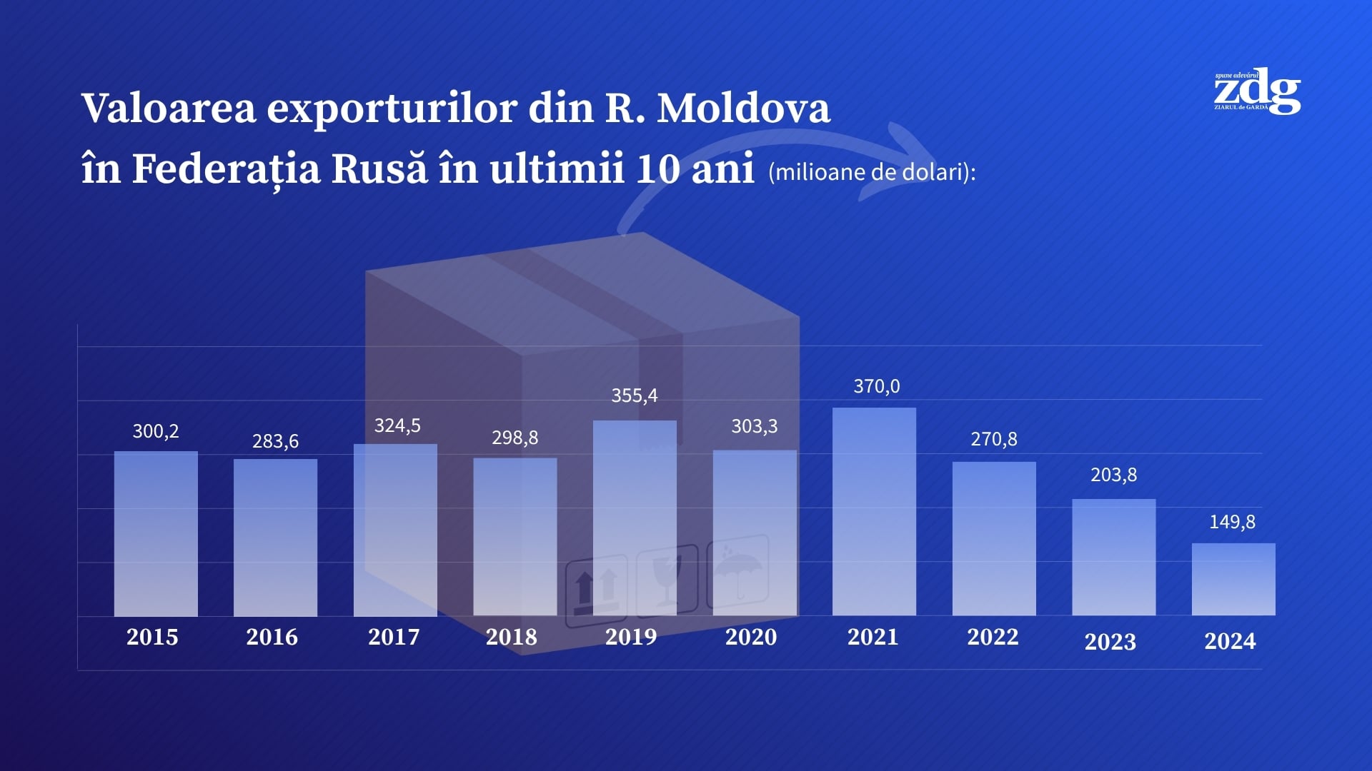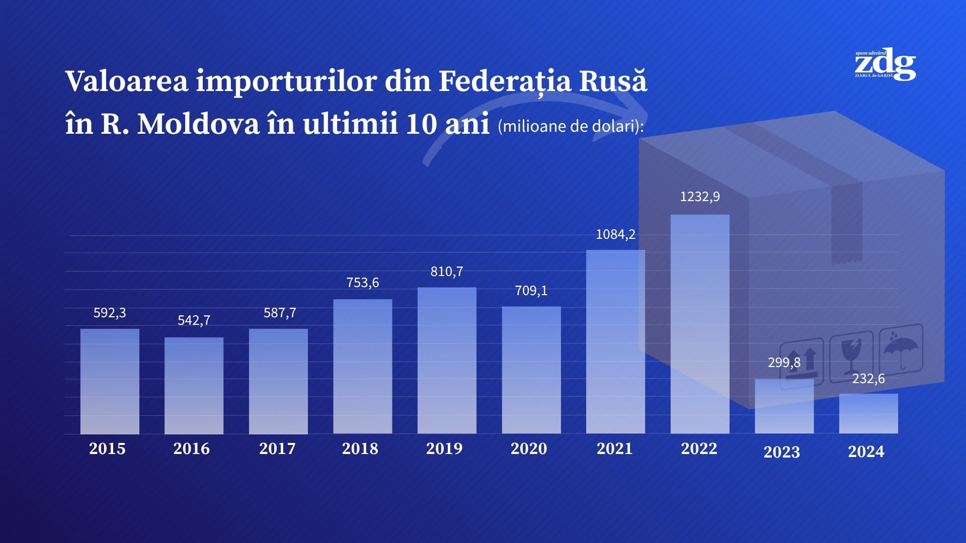Potrivit datelor oferite de Serviciul Vamal la solicitarea ZdG, valoarea totală a importurilor din Rusia în 2024 a fost de 228,1 milioane dolari, reprezentând doar 2,3% din numărul total de importuri. Printre produsele aduse de pe piața rusă se numără îngrășămintele minerale și chimice, cărbunele, condimentele, ciocolata, produsele de brutărie și altele.