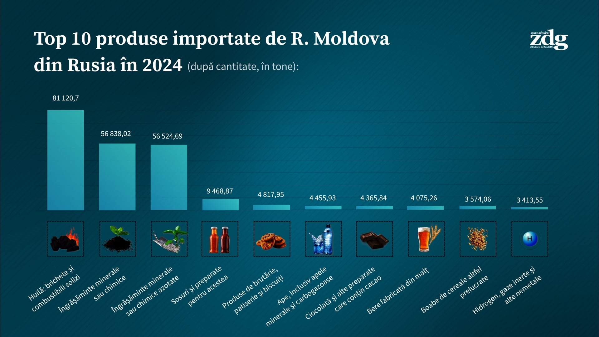 Astfel, cele mai mari cantități importate în 2024 provin din categoria îngrășămintelor chimice și minerale, care însumează peste 110 mii de tone. În total, aceste îngrășăminte au o valoare de peste 43 de milioane de dolari. La fel, în top este situat și huila, un tip de cărbune, cu peste 81 de mii de tone.