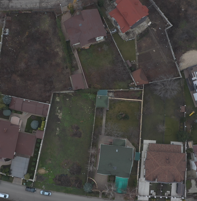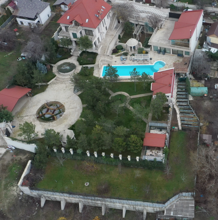 Am mers pe strada Lămâiței din capitală pentru a vedea lotul de pământ scos la licitație, însă a fost imposibil, întrucât este împrejmuit cu gard. Imaginile surprinse cu drona arată însă o curte imensă extinsă pe teren municipal: cu pavaj, copaci și clădiri auxiliare.