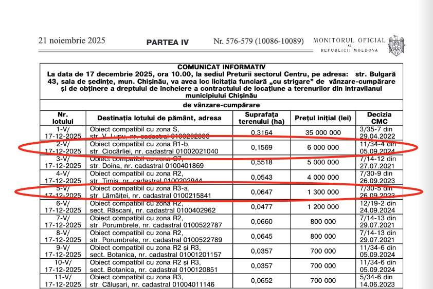 Așa se întâmplă că la 17 decembrie 2025, unul dintre cele două terenuri „adjudecate” de Perciun a ajuns pe lista celor care urmează să fie scoase la licitație pentru un preț inițial de 1,3 milioane de lei. Hotarele terenului au fost stabilite în 2023, printr-o decizie CMC.